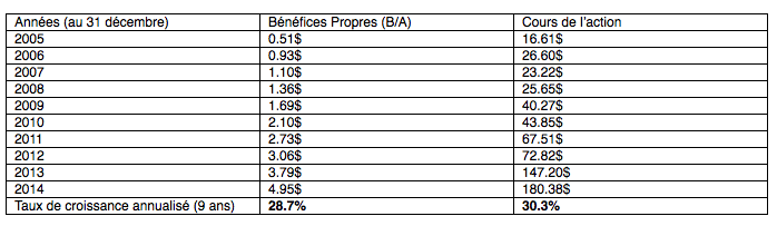 Il est passé de 16.61$ à 180.38$, pour une croissance annualisée de +30.3%.