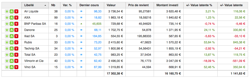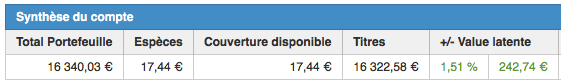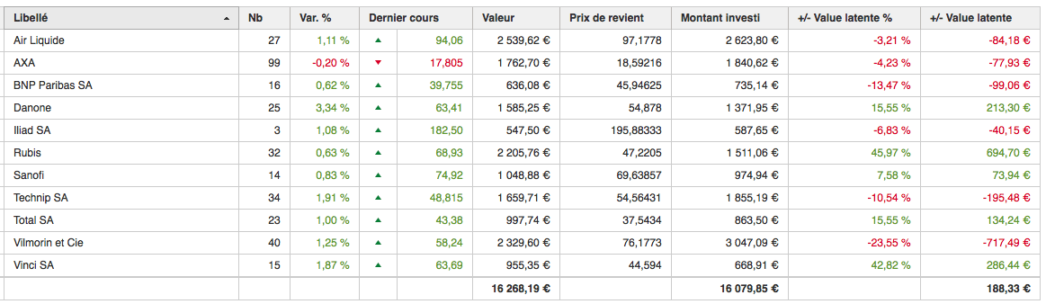 Au 01/01/2016 mon PEA totalisait 16705,75 €, au 31/08/2016, si je ne tiens pas compte des 500 € que j’ai investi de mon épargne, il totalise 17393 €.