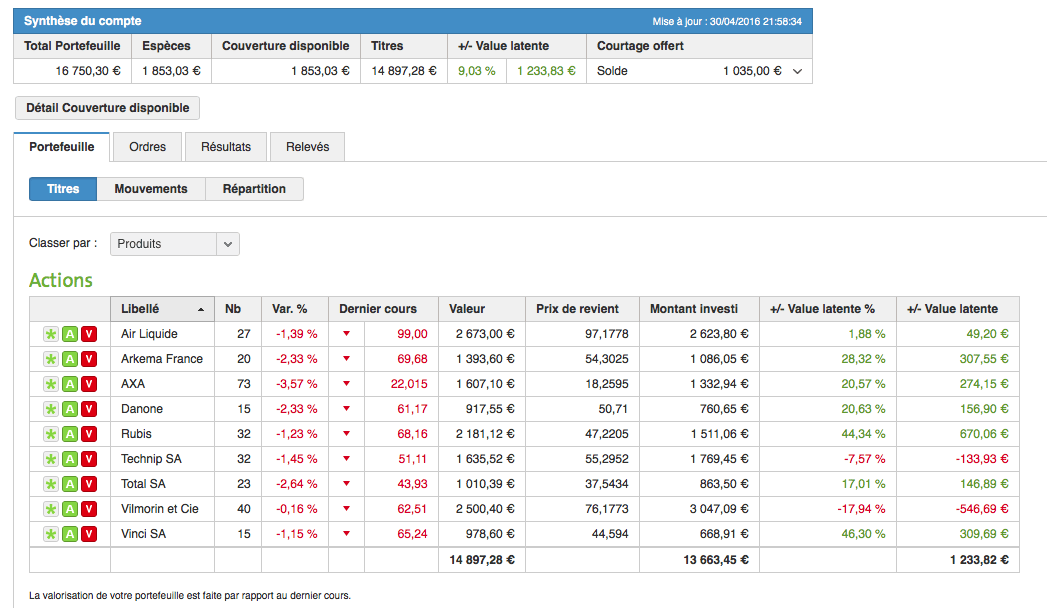 Position de mon PEA au mois d’avril 2016.
