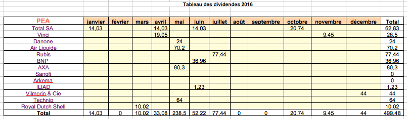 Fin 2016, le montant de mes dividendes sur le PEA était de seulement 499,48 €.
